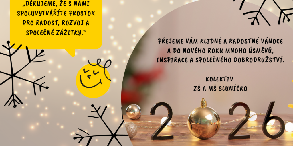 Vážení rodiče, milé děti a žáci, dovolte nám, abychom vám popřáli klidné a radostné vánoční svátky prožité v pohodě, zdraví a ve společnosti vašich blízkých. Ať jsou Vánoce časem odpočinku, vzájemného porozumění a krásných společných okamžiků. Do nového roku vám přejeme především pevné zdraví, optimismus, úspěchy ve škole i v osobním životě a mnoho důvodů…