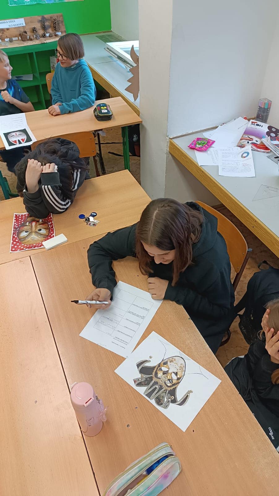 V pracovních činnostech se zaměřili na tradici masek napříč kulturami a časem. Každá dvojice si vybrala konkrétní masku, o které bádala a připravila prezentaci pro ostatní. Následně se žáci pustili do tvorby vlastní obličejové masky inspirované mýtickými či legendárními postavami.