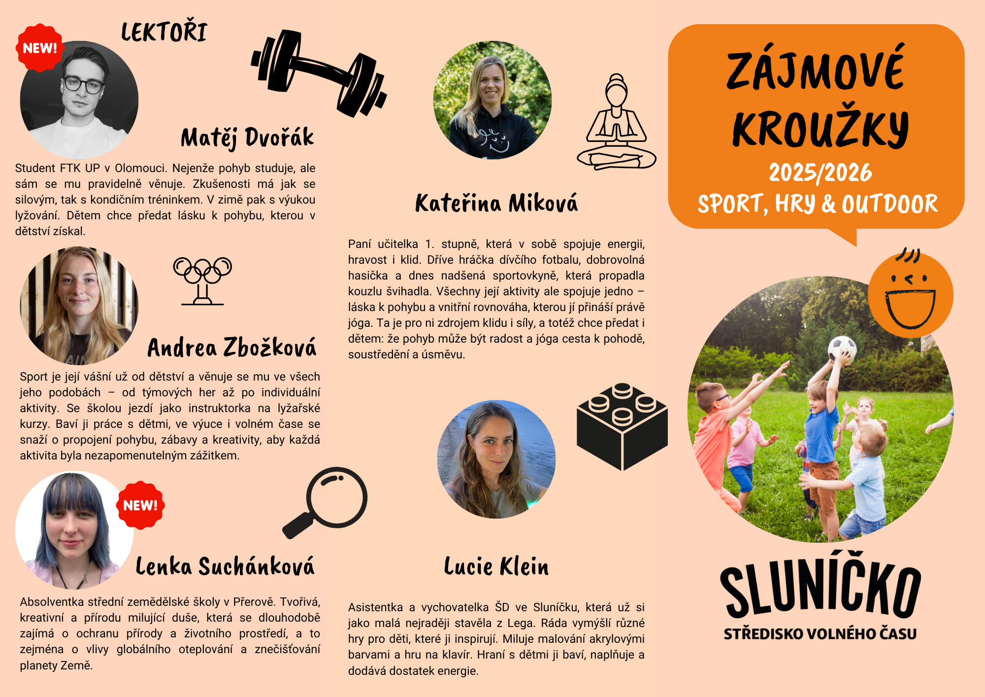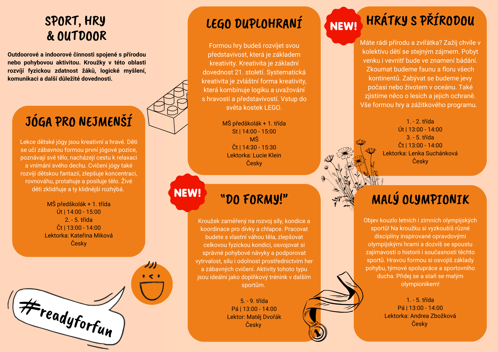 Kroužky vedou zkušení lektoři, kteří umějí děti motivovat a pracovat s nimi s respektem a citem v bezpečném prostředí školních učeben a školní zahrady.