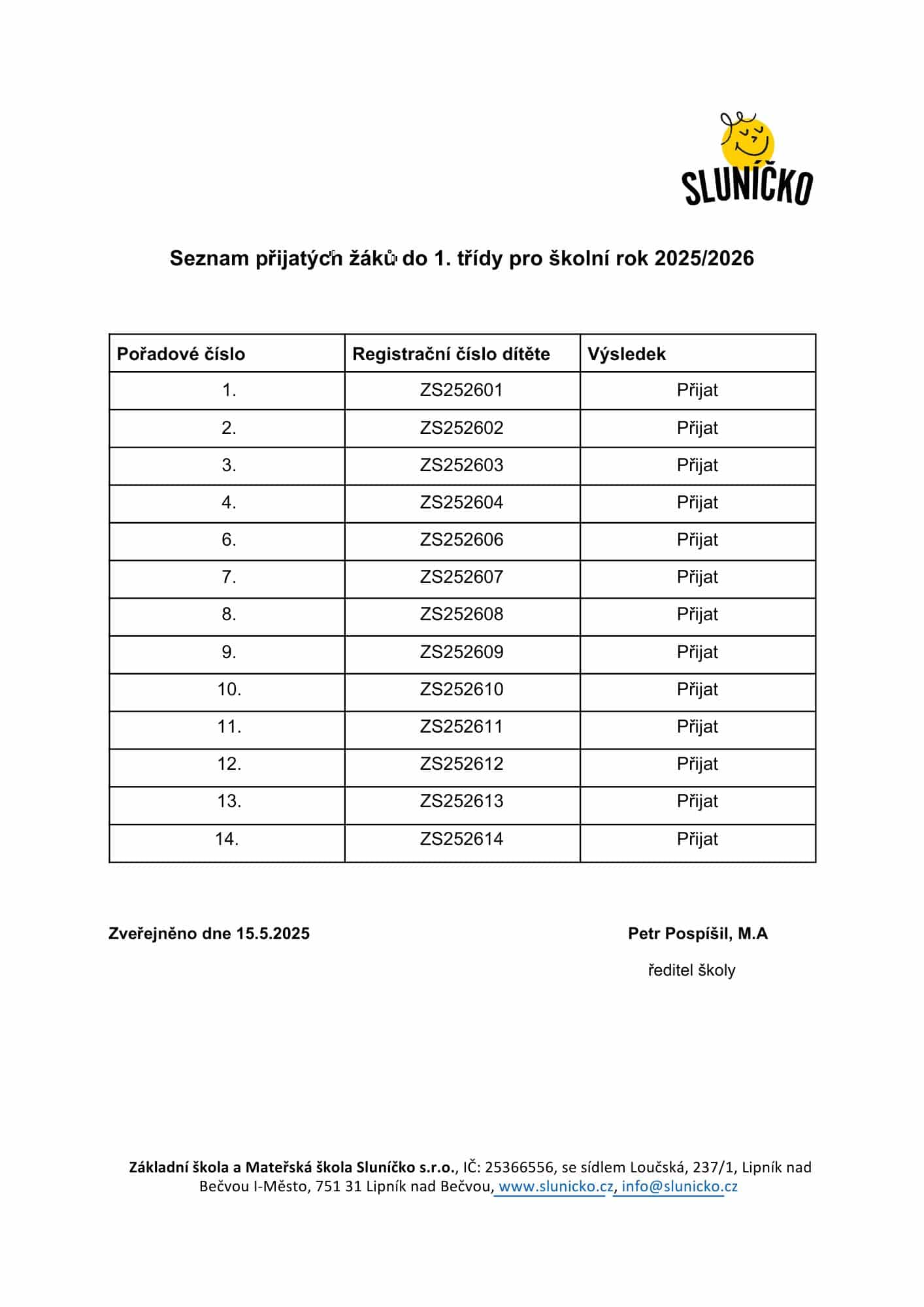 Výsledky zápisu do první třídy